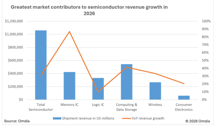 “Semiconductor revenue growth in 2026 is being driven by highly concentrated, AI-related demand, rather than broad-based consumer behavior or industrial production trends that have historically influenced the market. Without the contributions of memory and logic ICs, overall semiconductor revenue growth would fall from 30.7% to only 8%, highlighting the nature of the demand driving recent market surges,” said Myson Robles-Bruce, Senior Principal Analyst at Omdia.